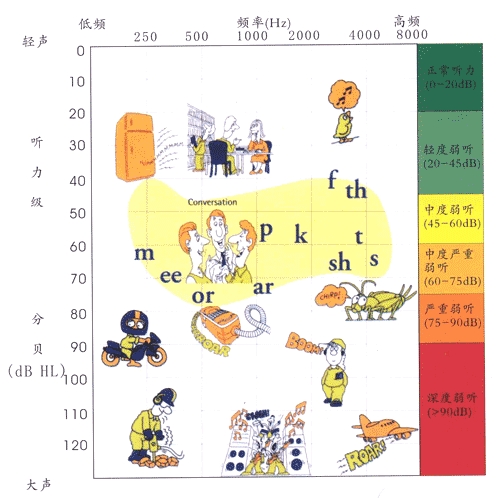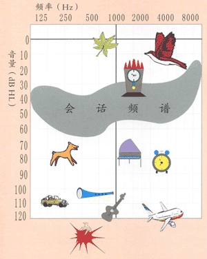 作一個實驗,取出孩子的聽力圖,把聽力曲線復制到下頁的圖上。此圖顯示某些特定的聲音在聲音頻譜圖上的位置,讓您知道孩子在不使用助聽器的情況下可能聽到什么聲音。高頻(尖音)在1000Hz線的右邊,低頻(沉音)在1000Hz線的左邊。陰影區域稱為“會話頻譜”,它顯示如要聽懂別人的正常說話(不是太微弱/不是太響亮)所需聽到的聲級。